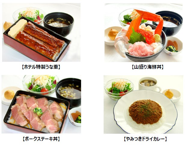 ほかにも、贅沢感を味わえる「うな重」や「海鮮丼」、柔らかく仕上げた豚肩ロースを使った「ポークステーキ丼」、7種類のスパイスを効かせたホテル自慢の「ドライカレー」をご提供しております。