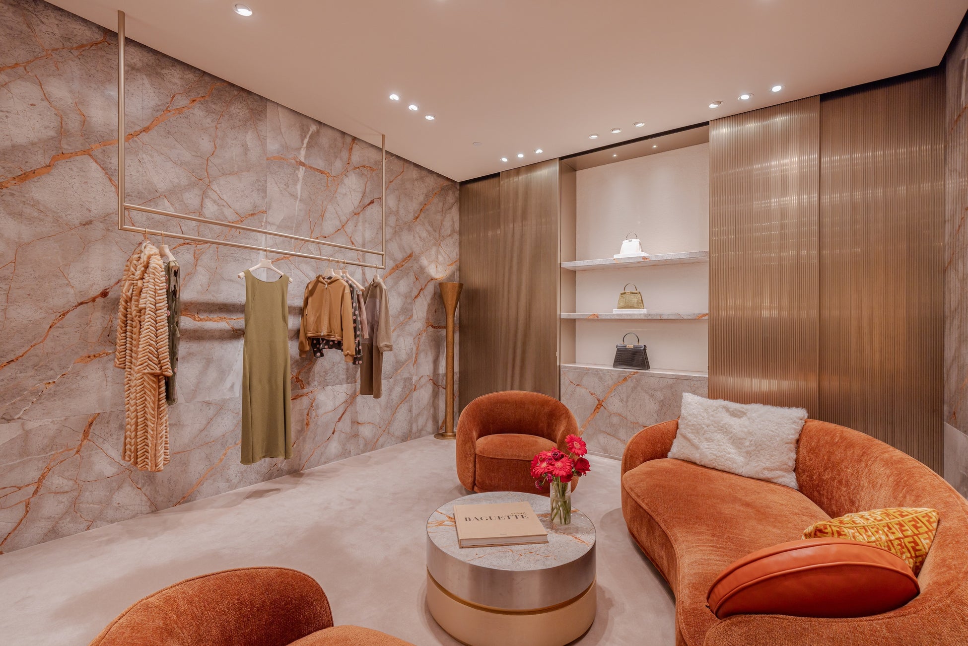 入り口に配置された二つのパタゴニア大理石のフォーカスウォールは、ブティック内のどこからでも目を引き、控えめな高級感を漂わせています。ハンドメイドのテクスチャーが施されたアンバー色のガラスが洗練されたアクセントとなり、壁面に配されたくぼみは立体的な石膏装飾で飾り立てられています。これらの装飾はフェンディのコードを反映し、「ペカン(Pequin)」ストライプや「FF」ロゴや立体的な菱形模様が取り入れられています。インテリアは、クリストフ・デルクール(Cristoph Delcourt)によるウォールナット材を使用した「Nin」テーブルやアルダ・イェニェ(Arda Yeniay)によるゴールドセーラム大理石を使用した「エタニティ(Eternity)」コンソール、フェンディ カーサ(FENDI Casa)のソファとアームチェアなど、厳選されたデザイン家具により一層引き立てられています。
