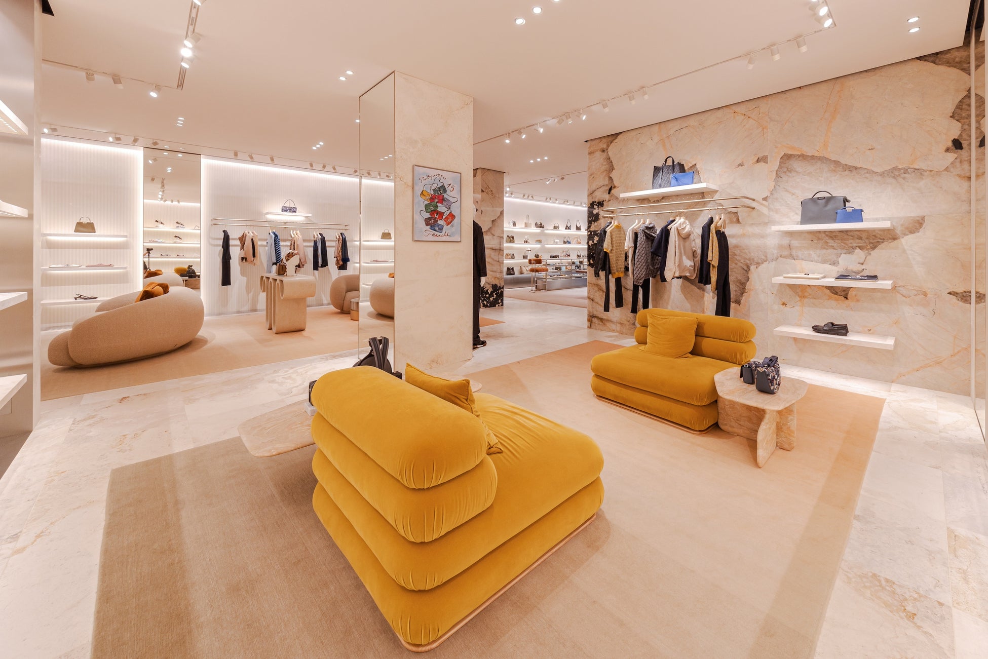 店内へと足を踏み入れると、ゲストは豪華なトラバーチン大理石、木材、そして特別なヴェルデ・アルガ・オニキス大理石を贅沢に使用したブティックに迎えられます。これらの素材使いはフェンディのコードと二面性(デュアリズム)の伝統を際立たせており、象徴的な「FF」ロゴも至る所に見られます。トラバーチン大理石は床や柱、棚に使われ、壁は古代遺跡を思わせるような滑らかさとうねりを持つ質感が組み合わされ、「FF」ロゴパターンで装飾されています。