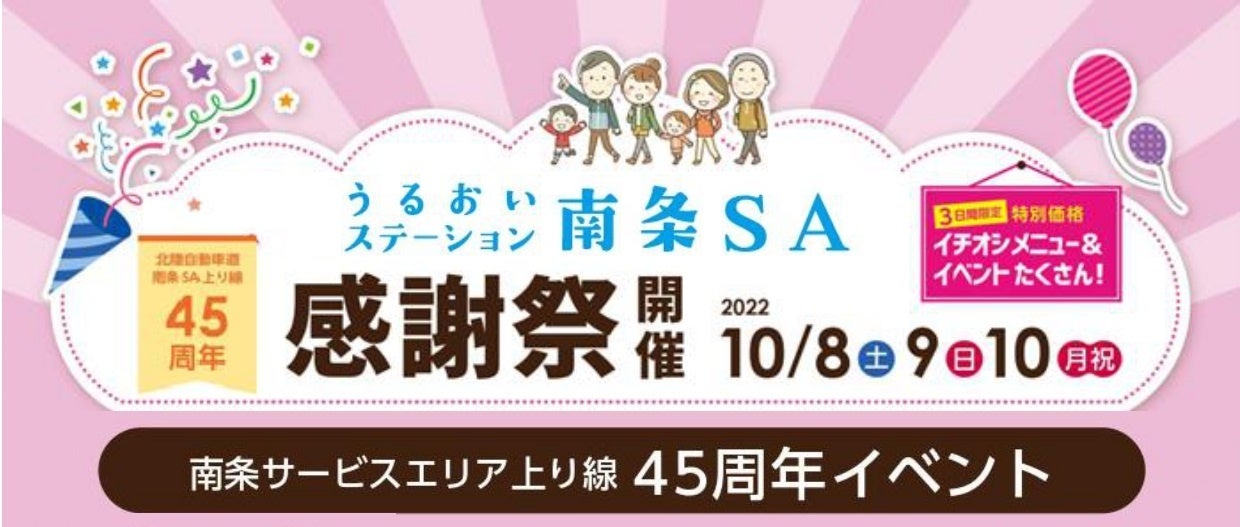 中日本エクシス株式会社 福井・近江支店(福井市、支店長・鈴木(すずき)智之(ともゆき))は、E8 北陸自動車道(北陸道)南条サービスエリア(SA)(上り、福井県南越前町)の開業45周年を記念して、以下のイベントを開催します。