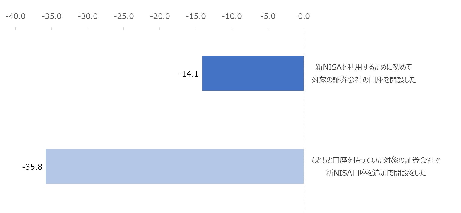 さらに、新NISA口座の開設の仕方別にNPSを分析したところ、「新NISAを利用するために初めて対象の証券会社の口座を開設した」人のNPSは-14.1ポイントと、「もともと口座を持っていた対象の証券会社で新NISA口座を追加で開設をした」人と比較して高い傾向がみられました。