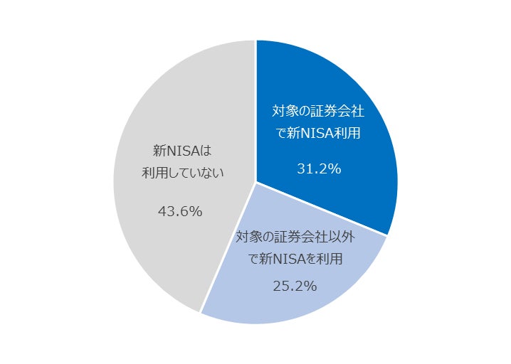 2024年から開始された新NISA制度について、利用状況を調査したところ、対象の証券会社で新NISAを利用しているのは31.2%、対象の証券会社以外で新NISAを利用しているのは25.2%となりました。