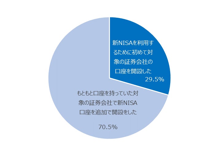 対象の証券会社で新NISAを利用している人に対し、新NISAの口座開設の仕方を調査したところ、「新NISAを利用するために初めて対象の証券会社の口座を開設した」人は29.5%、「もともと口座を持っていた対象の証券会社で新NISA口座を追加で開設をした」人は70.5%となりました。年代別に分析したところ、若年層ほど「新NISAを利用するために初めて対象の証券会社の口座を開設した」人の割合が高くなりました。