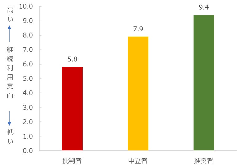対象の対面証券会社において、今後の継続利用意向を0~10の11段階でたずねたところ、「推奨者」(推奨度が「9」~「10」の回答者)は平均9.4ポイント、「中立者」(推奨度が「7」~「8」の回答者)は平均7.9ポイント、「批判者」(推奨度が「0」~「6」の回答者)は平均5.8ポイントとなり、推奨度が高いほど継続利用意向も高くなりました。