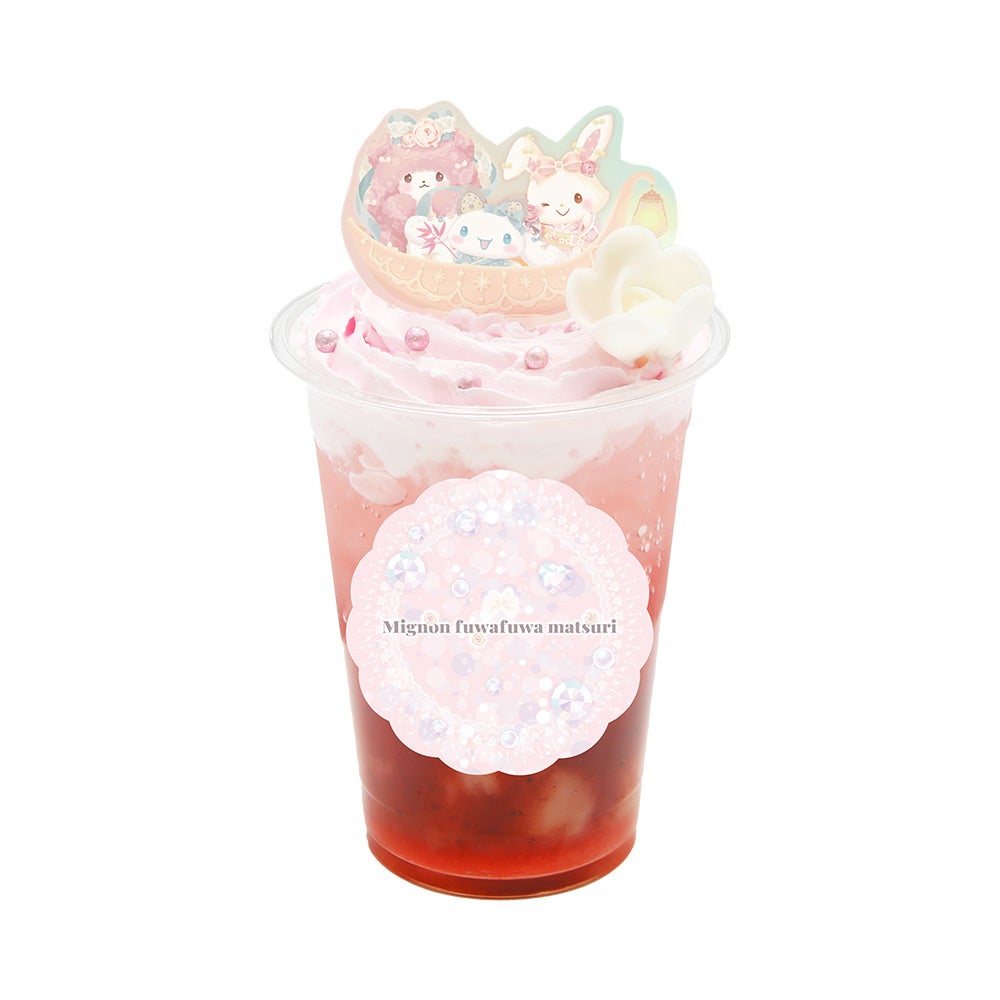 ピンク色のカレーとこぎみゅんがかわいらしい「こぎみゅんのまんまる小えびのピンクカレー」や、ハートのマカロンがキュートな「はなまるおばけのふわふわもちもちなのっ♪クレープ ~チーズ&レモンケーキ~」、シナモロール、ウィッシュミーメル、まるもふびよりがのった、いちごともものキュートなドリンク「Mignon fuwafuwa matsuri♡いちごともものしゅわサイダー」など、ふわふわかわいいメニューが登場します。