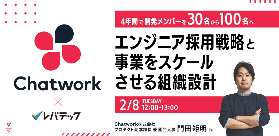 本ウェビナーでは、導入社数30万社を超えるビジネス向けチャットツール『Chatwork』を運営するChatwork株式会社プロダクト副本部長兼開発人事の 門田 矩明 氏をお招きし、同社が直面した深刻なマネージャー不足という課題をどのように乗り越えられたのか、エンジニア採用戦略と組織作りの観点からお話しいただきます。