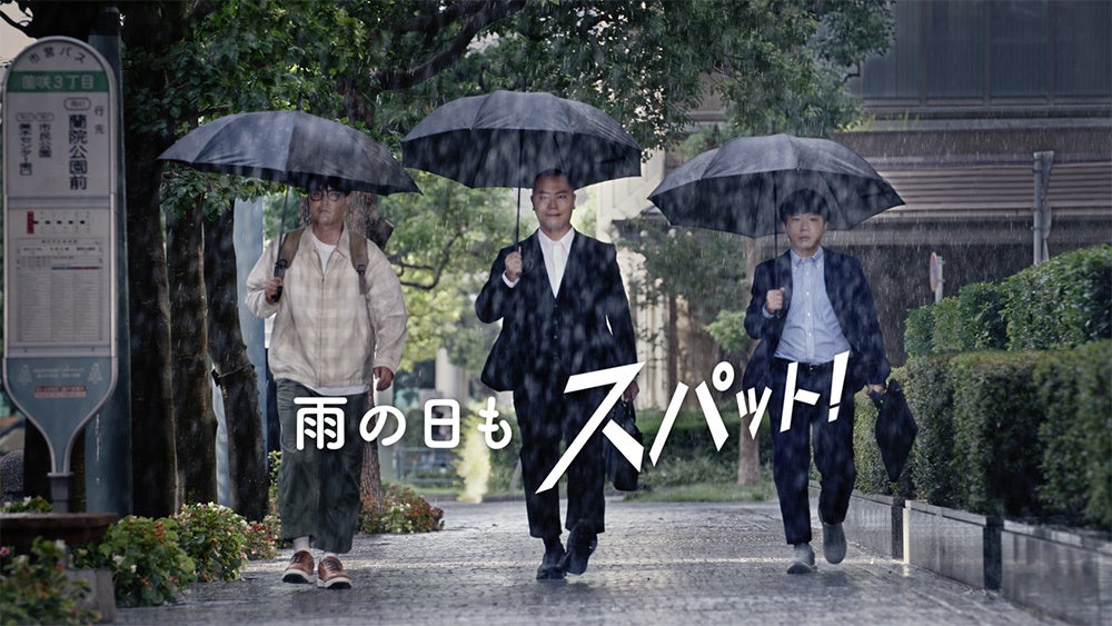 新TVCM「こんな場面でスパッと!試着室」篇では、秋のオシャレなコーディネートにぴったりなスパットシューズをご紹介。高橋みなみさんたちは試着した服を早く見せたくてワクワクしながら試着室から飛び出してきます。試着室の出入りはスパットシューズでスムーズに!一方、取り残されたハナコの3人の姿がユーモアたっぷりに描かれています。「雨、スローモーション」篇は、雨の日の出勤シーンが舞台。ハナコの3人は防水仕様(※)のスパットシューズを履いて、水たまりをものともせず、颯爽と歩いていきます!まるでドラマのワンシーンのようにスローモーションで映し出され、完璧にキマッた3人でしたが、高橋さんが忘れ物のお弁当を持って追いかけて来るという思わず笑みがこぼれる展開です。