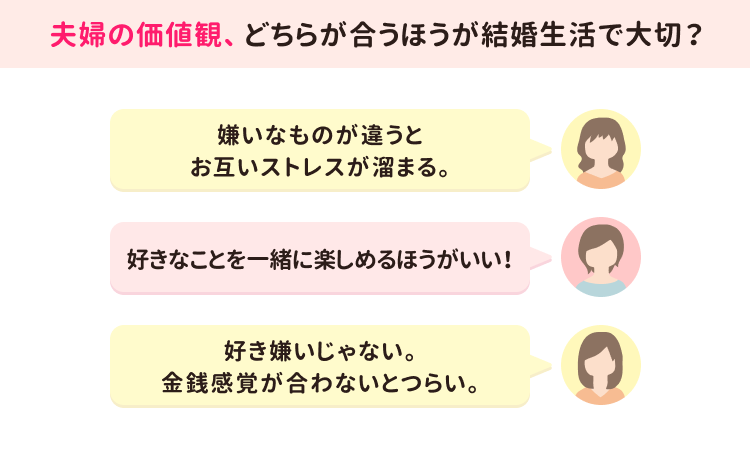 円満な結婚生活を続ける秘訣はさまざまあるなか、よく言われるのが「価値観の一致」です。好きなもの・楽しいものが一緒だと一見仲は深まりそうですが、じつは長い結婚生活となると嫌いなもの・苦手なものが一緒かどうかも重要となります。実際に結婚生活を長く送っている人は、どちらが大事と考えているのでしょうか。