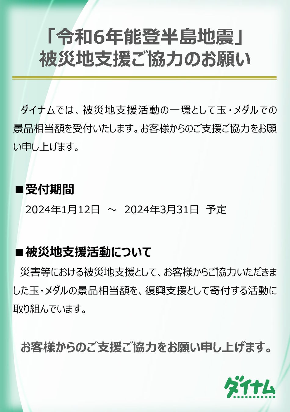 株式会社ダイナム(本社:東京都荒川区西日暮里 代表取締役:保坂 明)は、令和6年能登半島地震による甚大な被害を鑑み、石川県に対して義援金2,000万円の緊急支援を行うことを決定いたしました。