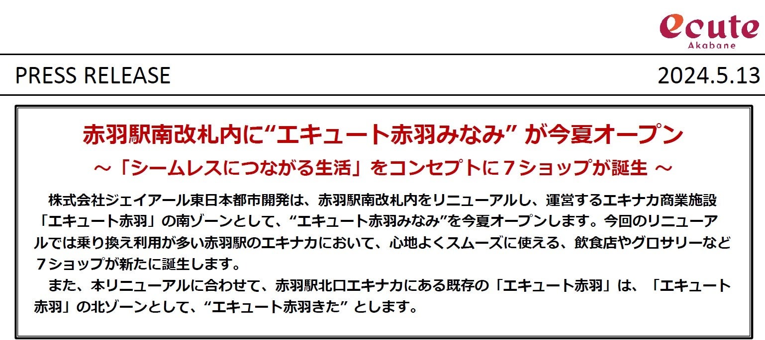 赤羽駅南改札内をリニューアルし、運営するエキナカ商業施設「エキュート赤羽」の南ゾーンとして、“エキュート赤羽みなみ”を今夏オープンします。今回のリニューアルでは乗り換え利用が多い赤羽駅のエキナカにおいて、心地よくスムーズに使える、飲食店やグロサリーなど7ショップが新たに誕生します。