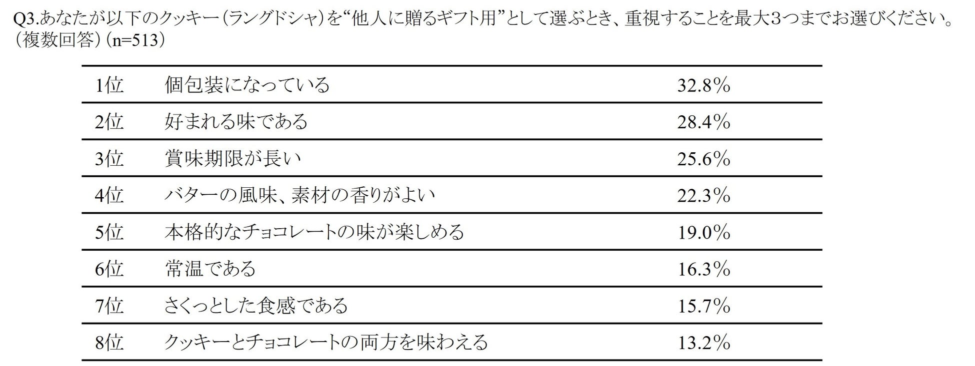 1位は「個包装になっている」が32.8%、2位は「好まれる味である」で28.4%、3位「賞味期限が長い」、4位「バターの風味、素材の香りがよい」、5位「本格的なチョコレートの味が楽しめる」という結果となりました。