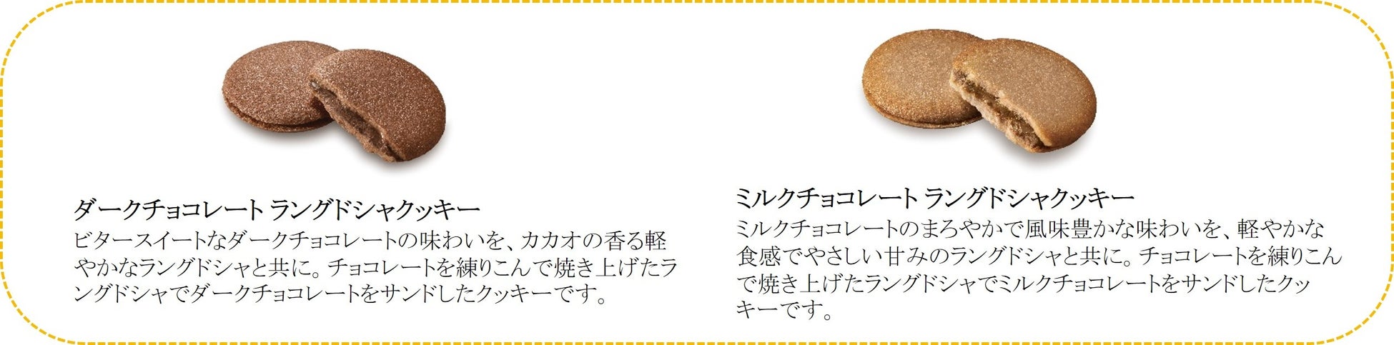 今回のリニューアルでは、サクッとした口あたりと、風味豊かなチョコレートのハーモニーはそのままに、ラングドシャ生地にチョコレートを練りこむことでチョコレート感をアップしました。ショコラティエの作るラングドシャクッキーならではのチョコレートの味わいをお楽しみいただけます。またパッケージは、より洗練されたデザインに変更しまし
