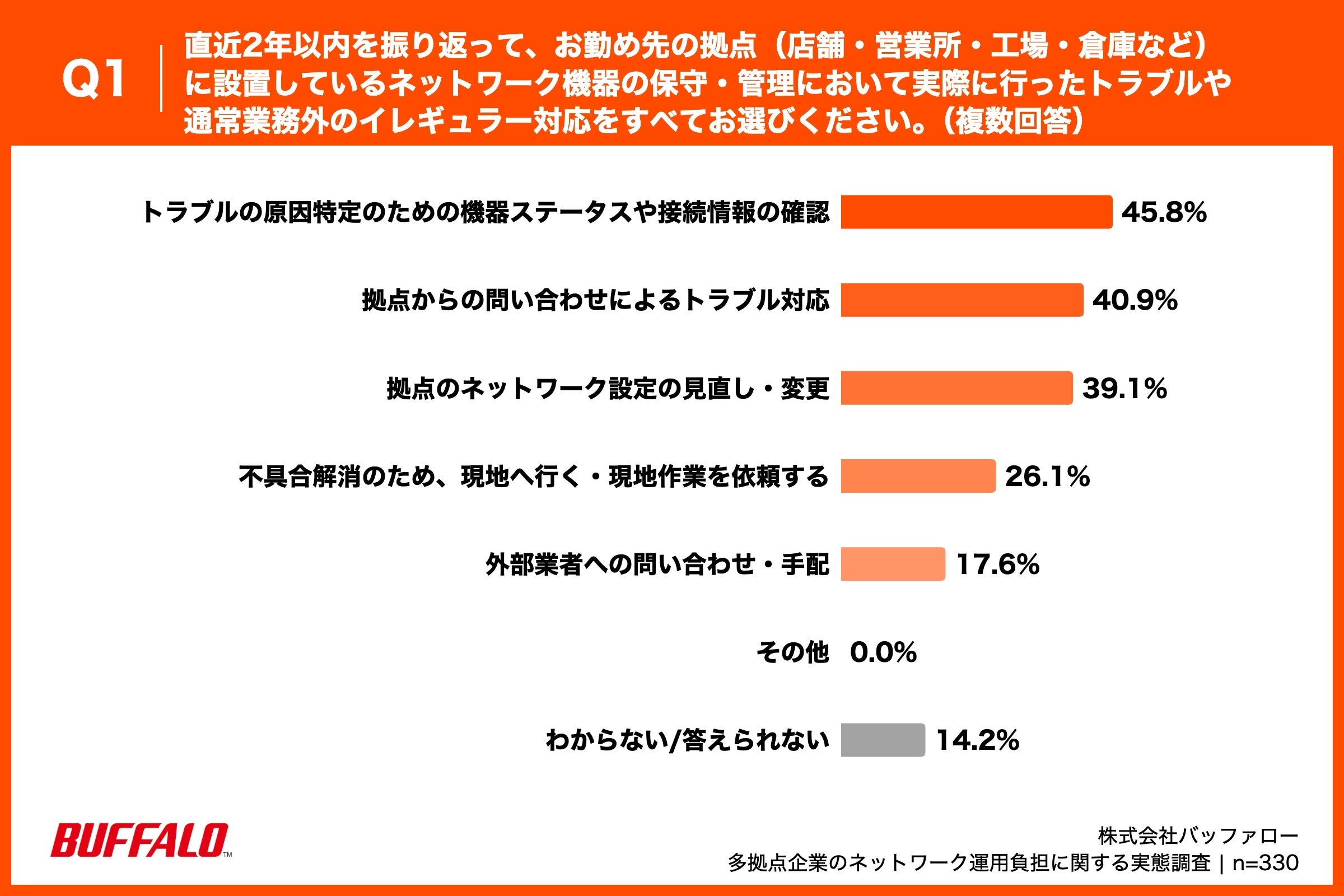 「Q1. 直近2年以内を振り返って、お勤め先の拠点(店舗・営業所・工場・倉庫など)に設置しているネットワーク機器の保守・管理において実際に行ったトラブルや通常業務外のイレギュラー対応をすべてお選びください。(複数回答)」(n=330)と質問したところ、「トラブルの原因特定のための機器ステータスや接続情報の確認」が45.8%、「拠点からの問い合わせによるトラブル対応」が40.9%、「拠点のネットワーク設定の見直し・変更」が39.1%という回答となりました。