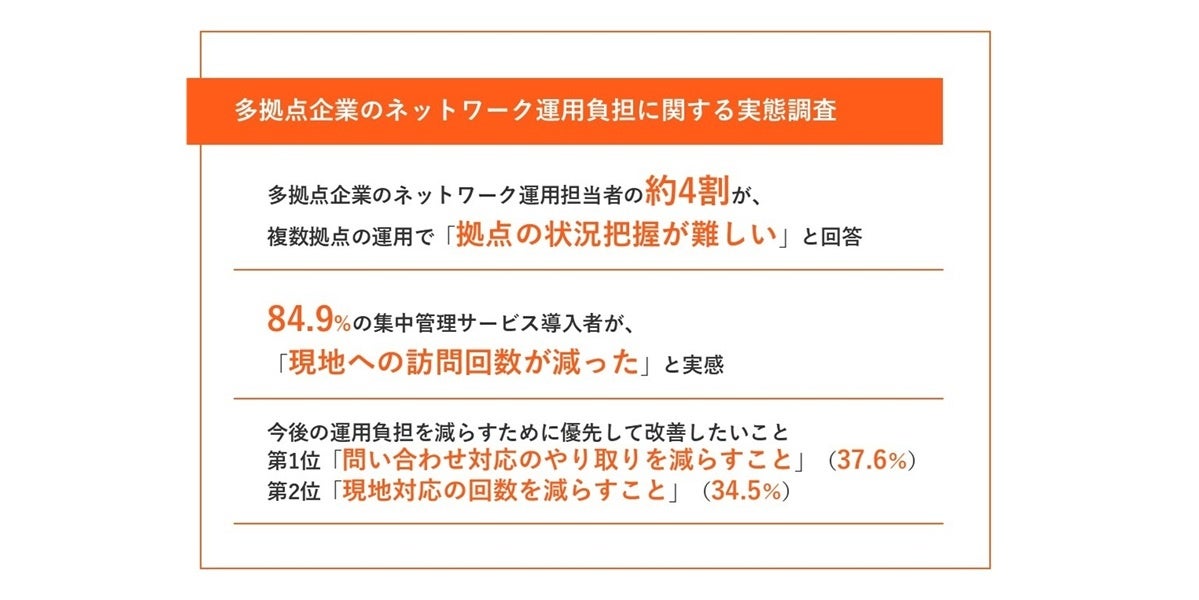 多拠点ネットワークの運用課題は「状況把握」と「現地対応」。集中管理サービス導入で84.9%が「訪問回数減」を実感【多拠点企業のネットワーク運用負担に関する実態調査】