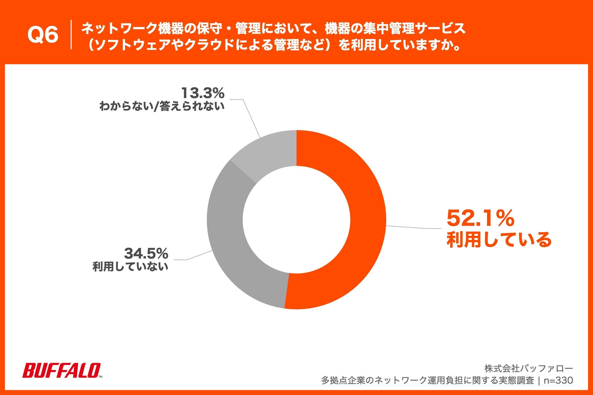 「Q6. ネットワーク機器の保守・管理において、機器の集中管理サービス(ソフトウェアやクラウドによる管理など)を利用していますか。」(n=330)と質問したところ、「利用している」が52.1%、「利用していない」が34.5%という回答となりました。