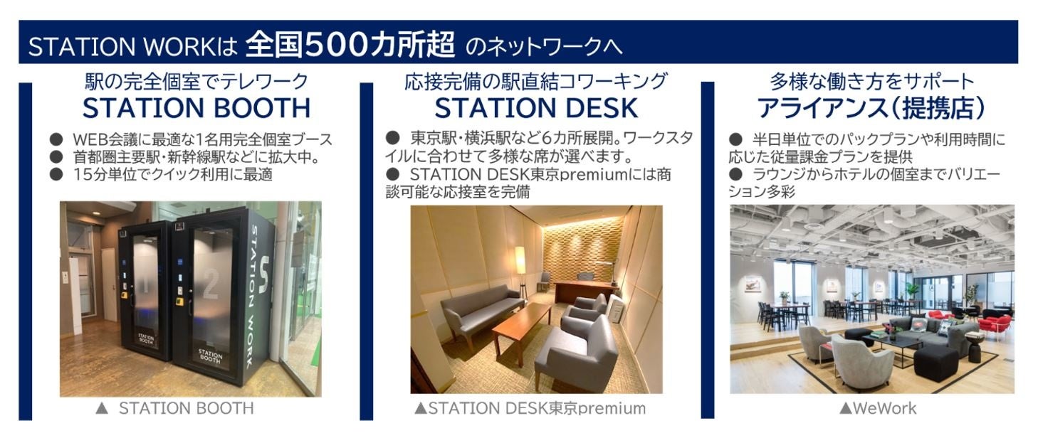 駅の便利な個室ブースSTATION BOOTHをはじめ、ビジネスエアポートやWeWorkといったシェアオフィス事業やビジネスホテル・シティホテルとの提携と各種アライアンスを強化し、さらに多様化するワークプレイスニーズに応えてまいります。