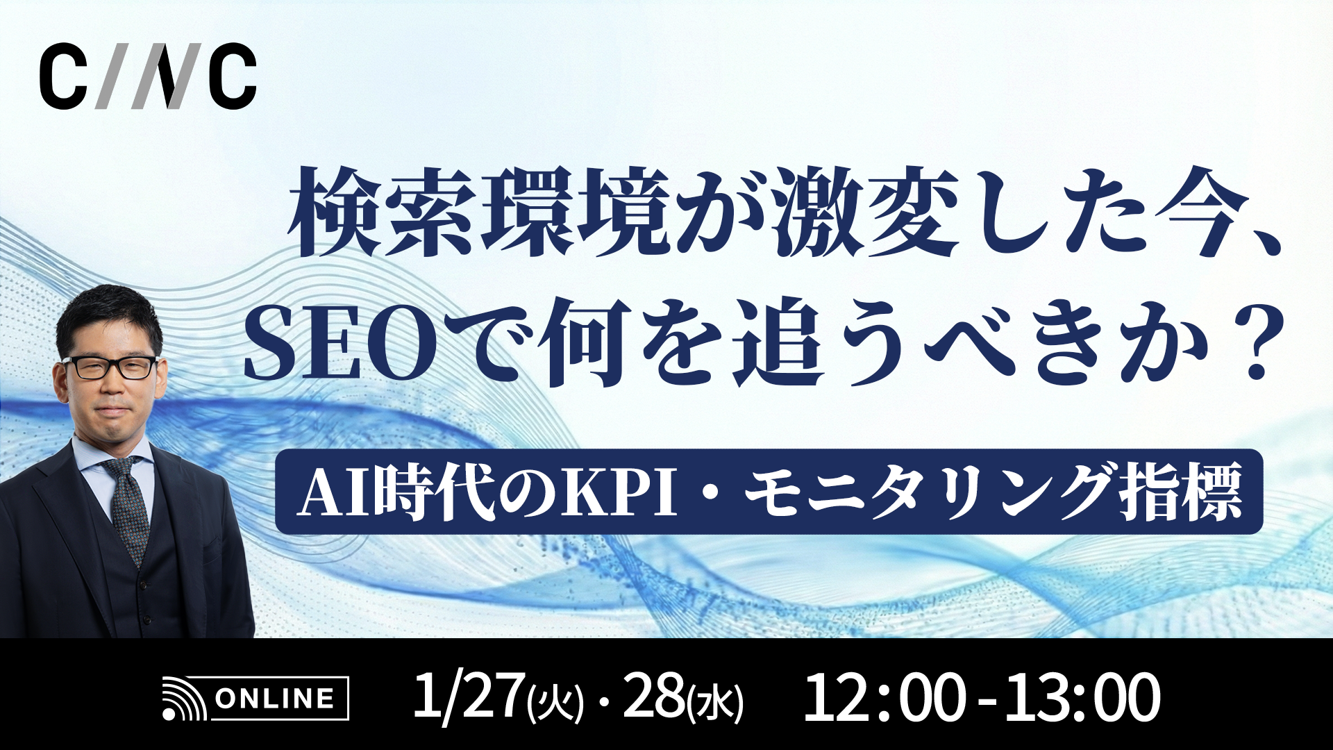 株式会社CINC(本社:東京都港区、代表取締役社長:石松友典、以下CINC)は、2026年月27日(火)~28日(水)にオンラインセミナー『検索環境が激変した今、SEOで何を追うべきか?AI時代のKPI・モニタリング指標』を開催いたします。