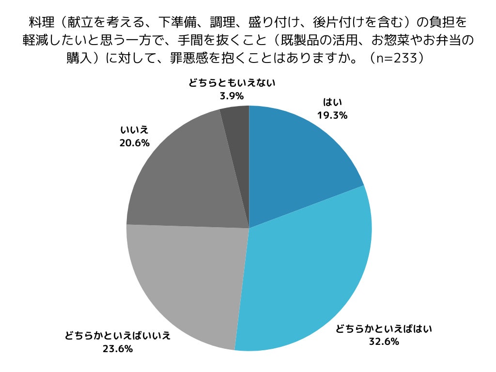 料理の負担を軽減したい頻度は「毎回」「ほぼ毎回」が70%以上!一方で手抜き料理に罪悪感を抱く人は2人に1人、多くの方がジレンマを感じている結果に。そんな人におすすめしたい、永谷園の新商品「本日の逸品」