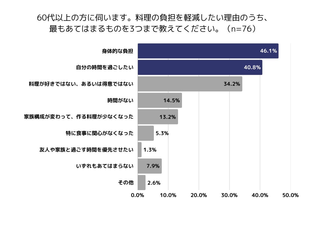 ・特に、高齢者とされる60代以上が料理の負担を軽減したいと強く思っており、料理に負担を感じている理由は「身体的な負担」「自分の時間を過ごしたい」