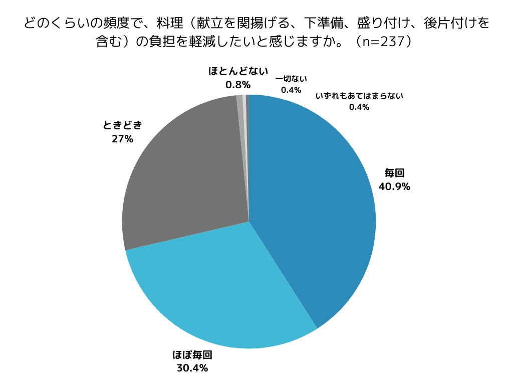 家事の中でも特に負担の大きい「料理」について質問をしたところ、料理の負担を軽減したいと感じる頻度について「毎回」「ほぼ毎回」と回答した方が70%以上となりました。