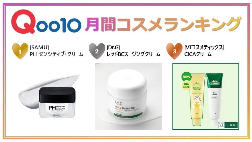 Qoo10(https://www.qoo10.jp/)サイト上、「乳液・クリーム」「リップ」「アイシャドウ」「チーク」カテゴリーの各販売個数に基づいたランキングです。