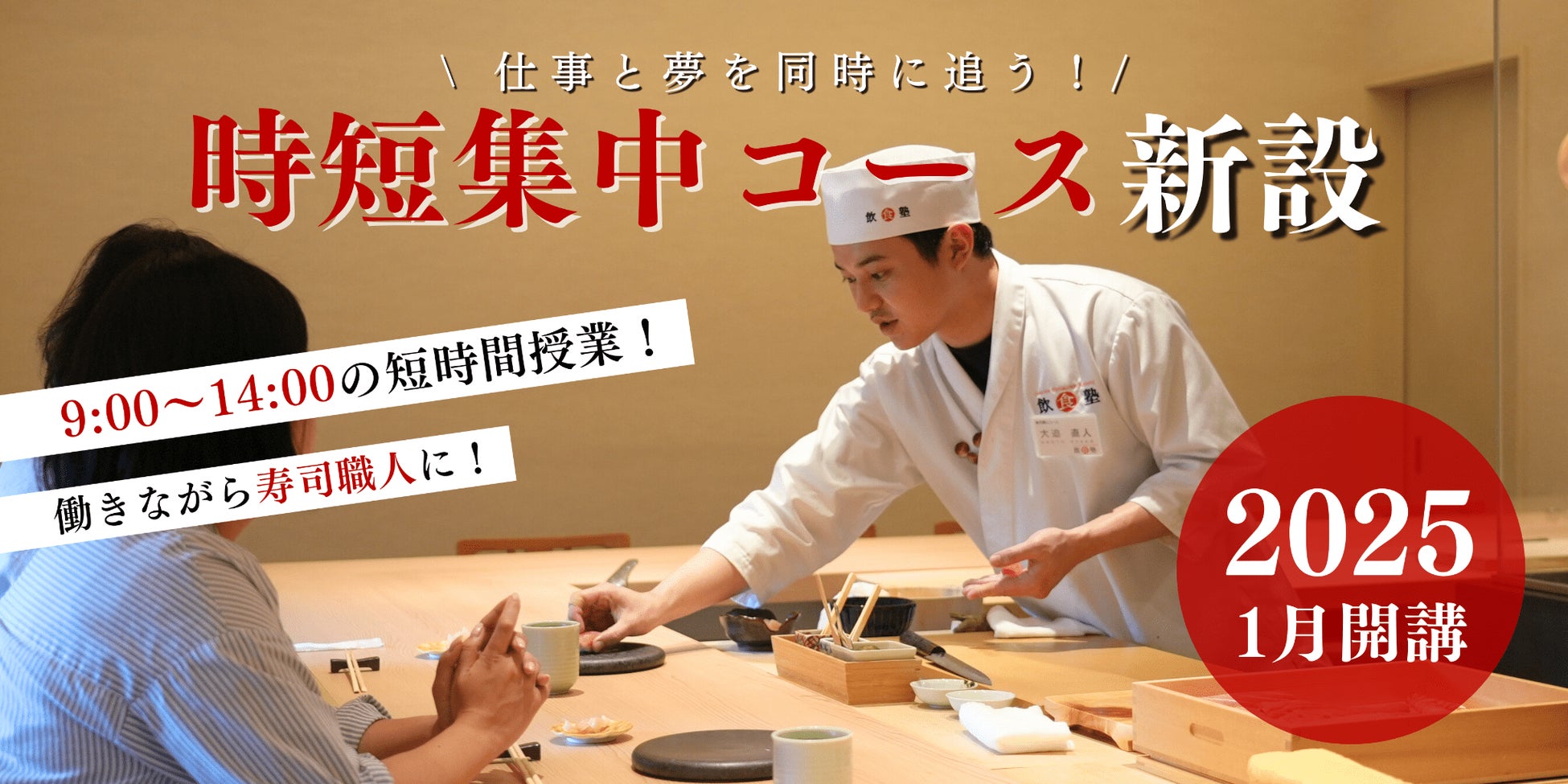 日本国内だけでなく世界でもひっぱりだこの寿司職人!自分も寿司職人になって活躍したいという夢を持つものの、時間的・金銭的に難しい……。そんな方々を応援するために、働きながら学べる新コース「時短集中コース」が誕生!