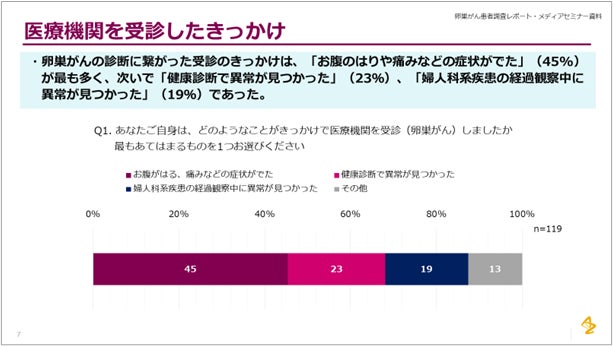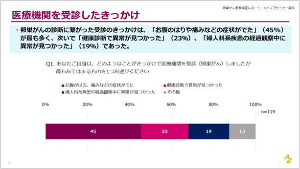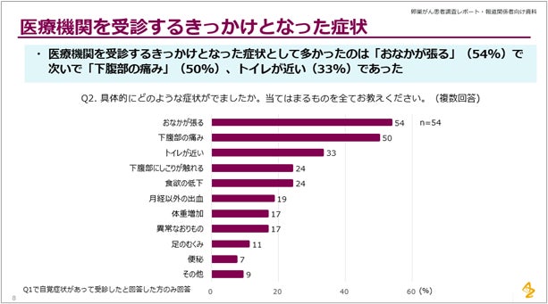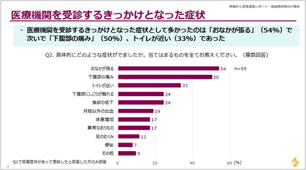 本調査から、卵巣がんの診断に繋がった受診のきっかけとして、「お腹がはる、痛みなどの症状がでた」(45%)、「健康診断で異常が見つかった」(23%)、「婦人科系疾患の経過観察中に異常が見つかった」(19%)となっており、受診のきっかけとなった主な症状は、「おなかが張る」(54%)、「下腹部の痛み」(50%)、「トイレが近い」(33%)といった日常生活に多くみられる症状が挙げられました。