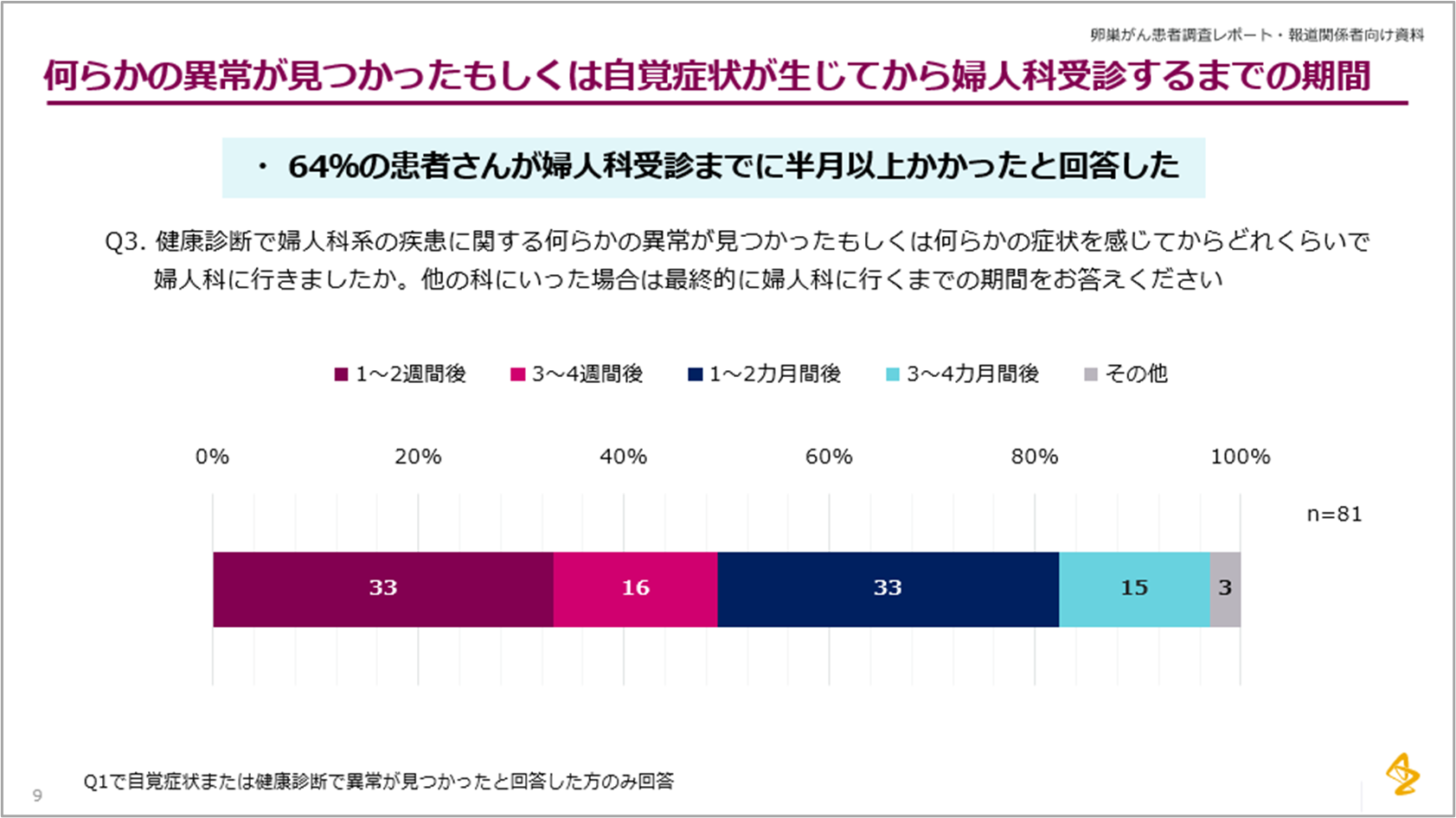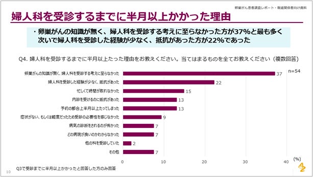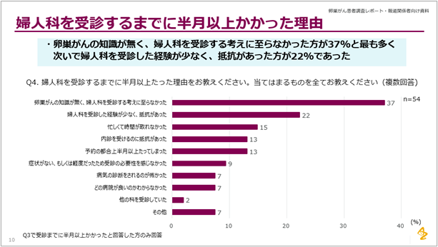 何らかの自覚症状または健康診断で異常が見つかってから婦人科を受診するまでの期間としては、64%が半月以上かかったと回答。その理由としては、「卵巣がんの知識が無く、婦人科を受診する考えに至らなかった」(37%)が最も多く、「婦人科を受診した経験が少なく、抵抗があった」(22%)、「内診を受けるのに抵抗があった」(13%)と、婦人科受診への抵抗を示す回答もみられました。このような結果から、多くの患者さんが自覚症状を生じた後も、受診/診断を先延ばしにしてしまっていたことが伺えます。