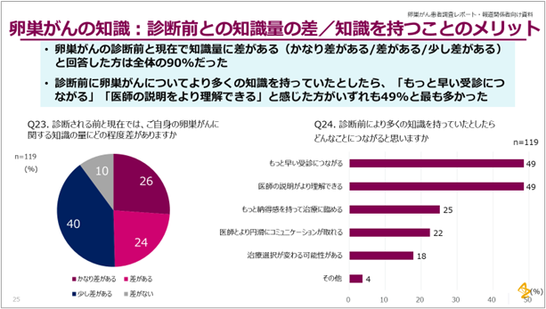 また、卵巣がんの知識において、診断前との知識量の差や知識を持つことのメリットに関する質問では、全体の90%が「診断前と現在で知識量に差がある(かなり差がある/差がある/少し差がある)」と回答し、診断前に卵巣がんについてより多くの知識を持っていたとしたら、「もっと早い受診につながる」あるいは「医師の説明をより理解できる」と感じた方がいずれも49%と最も多く挙げられました。これらの結果から、一般女性における卵巣がんの認知度を高めることで卵巣がんの早期診断に寄与することが期待できるとともに、診断前から疾患に関する知識を持つことは卵巣がん治療に対する理解をより深めることにもつながる可能性が示唆されました。