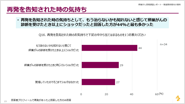 再発を告知された時の気持ちとしては、「もう治らないかも知れないと感じて卵巣がんの診断を受けたとき以上にショックだった」と、がんの診断を受けた時よりもショックが大きかったと回答した人が44%おり、再発が患者さんに与える精神的な負担の大きさが示唆されました。