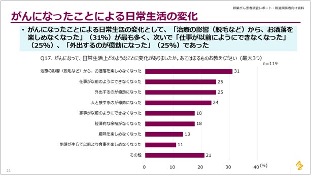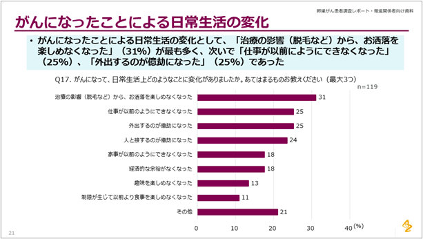がんになって日常生活に生じた変化としては、「治療の影響(脱毛など)から、お洒落を楽しめなくなった」と回答した方が最も多く(31%)、次いで「仕事が以前のようにできなくなった」(25%)、「外出するのが億劫になった」(25%)といった回答が挙げられ、患者さんが外見の変化に対応し、社会生活を送りやすくなるための支援であるアピアランスケアの重要性が示唆された結果となりました。