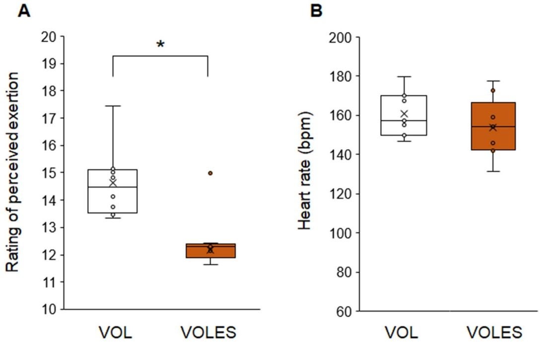 運動中における酸素摂取量および心拍数は両群の間に有意な差はなかったが、自覚的運動強度はVOL群(14.9±1.8)がVOLES群(12.0±1.5)に比べて有意に高かった。トレーニング介入前後における同一負荷自転車運動では、両群ともに介入後の酸素摂取量、心拍数、血中乳酸値が有意に低下し、これらの低下率に群間差は無かった。