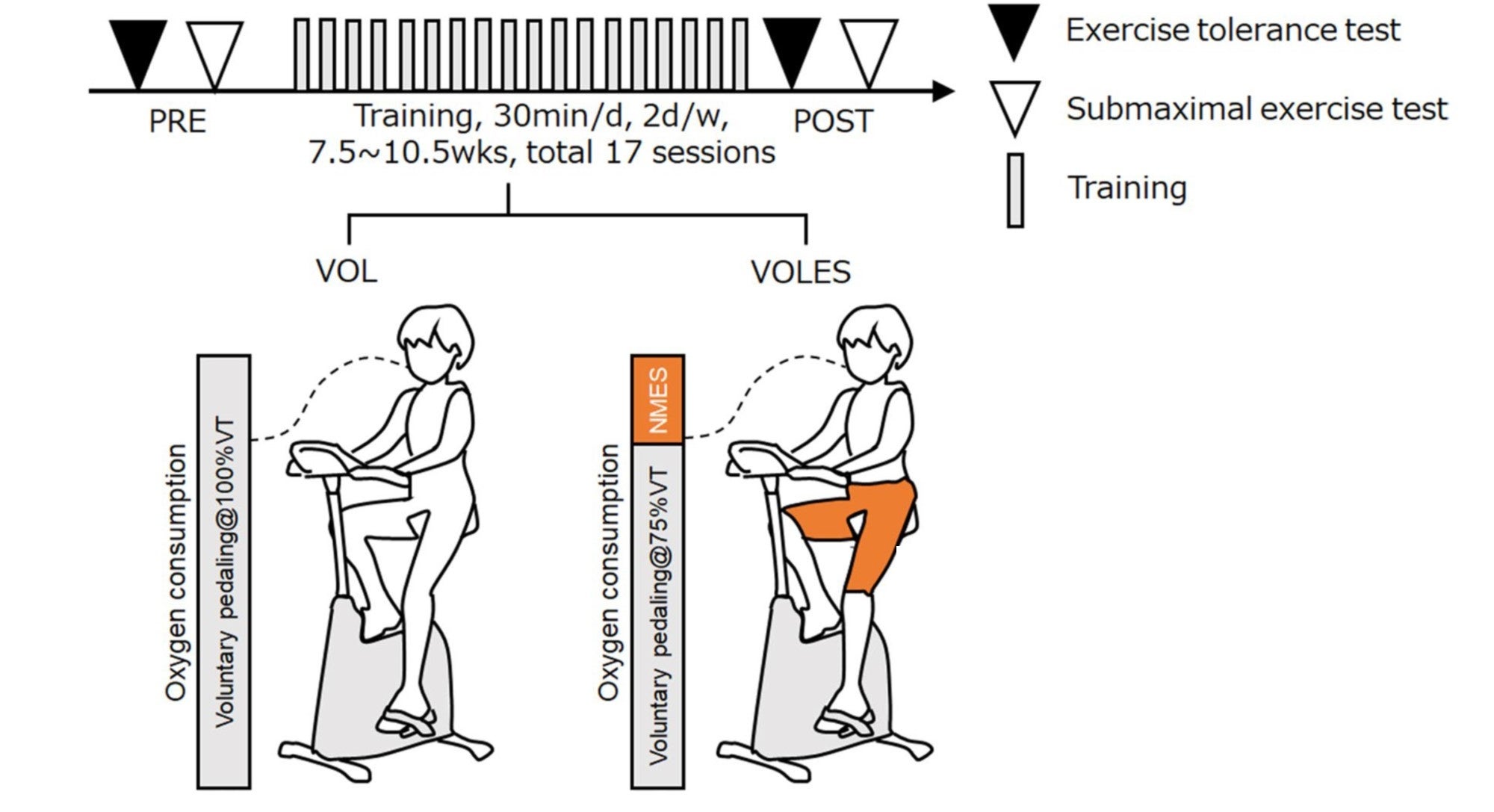 若齢男女8名および9名は、それぞれ換気性作業閾値の100%(VOL群)および75%(VOLES群)に相当する運動強度で30分間の自転車運動を週2回、9週間実施した。VOLES群は、大腿部と臀部にESを付加しながら、運動を実施した。