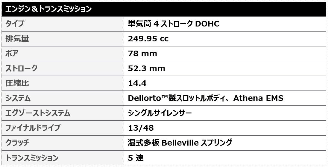 Exedy製クラッチとBrembo製油圧システムを採用した5速ギアボックスにより、スムーズで正確な変速を実現し、クイックシフターはクラッチレスで2速から5速へのシフトアップを可能にします。