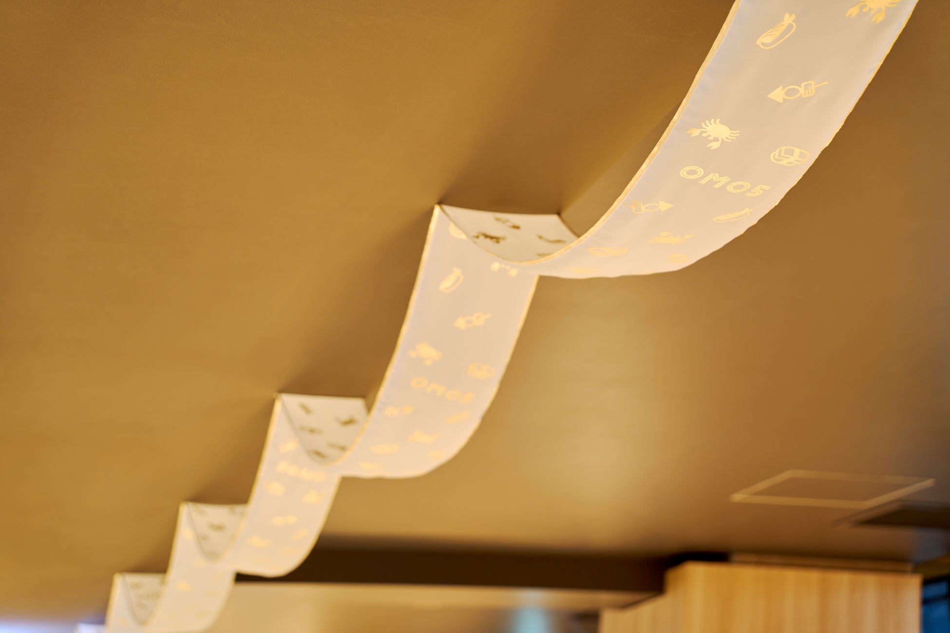 テンションが上がるパブリックスペース「OMOベース」は、昨年に続き、箔一の職人が一つひとつ手作業で制作した装飾で彩られています。今年は、金属で細工した骨組みに、さまざまな形と大きさの金箔を掛けた高さ約2mのクリスマスツリーをご近所マップ横に設置します。内側にライトを組み込むだけでなく、回転台の上に置くことで、館内照明や外からの自然光と相まって、金箔独特のきらめきがより際立ちます。夜だけでなく昼間にも楽しめる仕様です。その他、金沢ならではのイラストを金箔で布に絵付けしたドレープ状の天井装飾や、冬の風物詩「雪つり」をイメージに、金箔を施したテグスで作った装飾など、OMOベース全体が金箔を使った装飾で彩られています。