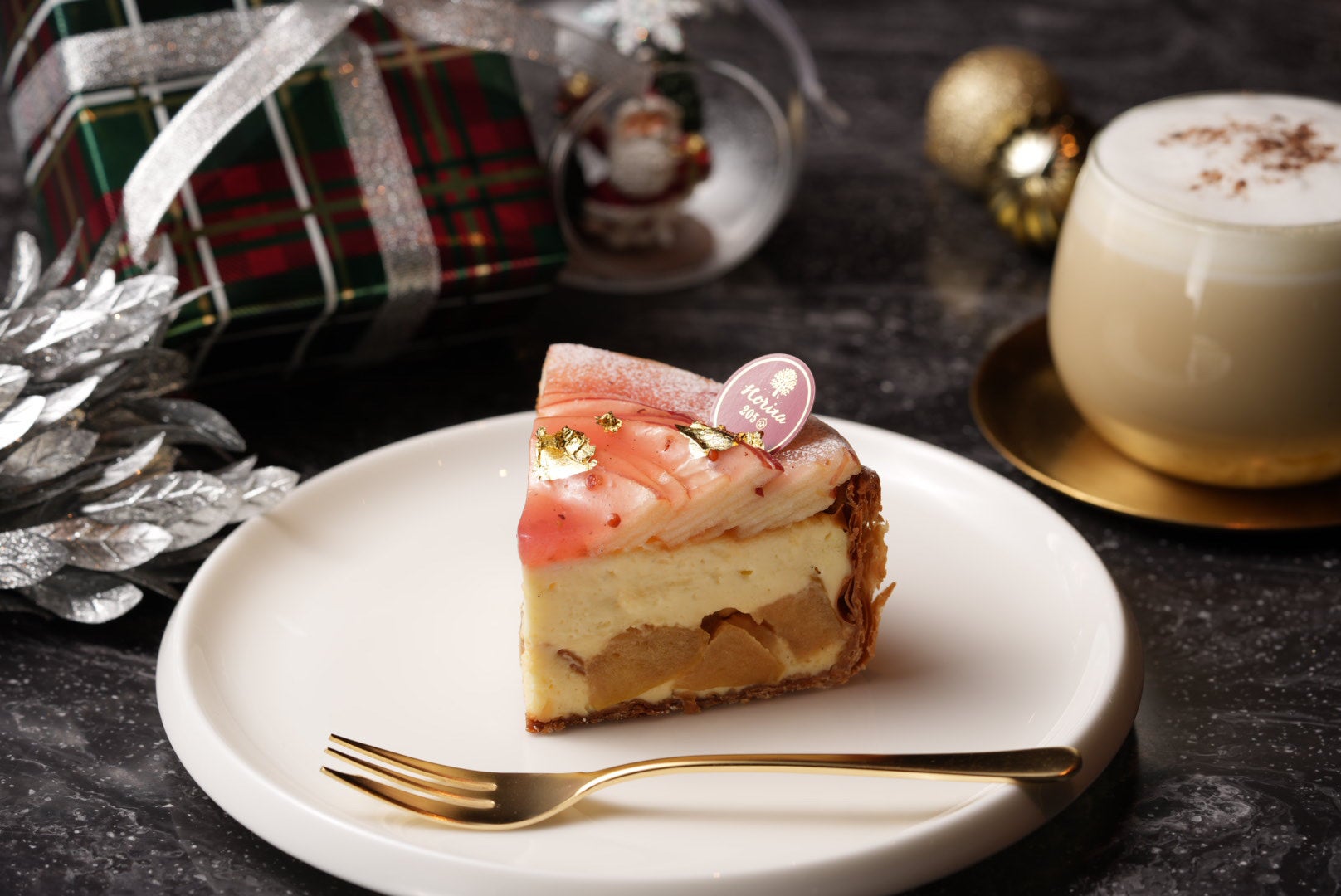サクサクのパイと、とろっとクリーミーなチーズケーキの中にはリンゴのタタンが入っています。上にはフレッシュなリンゴをスライスして敷き詰めました。フレッシュとタタンの二つの味と食感の違いを楽しめるリンゴのチーズパイです。