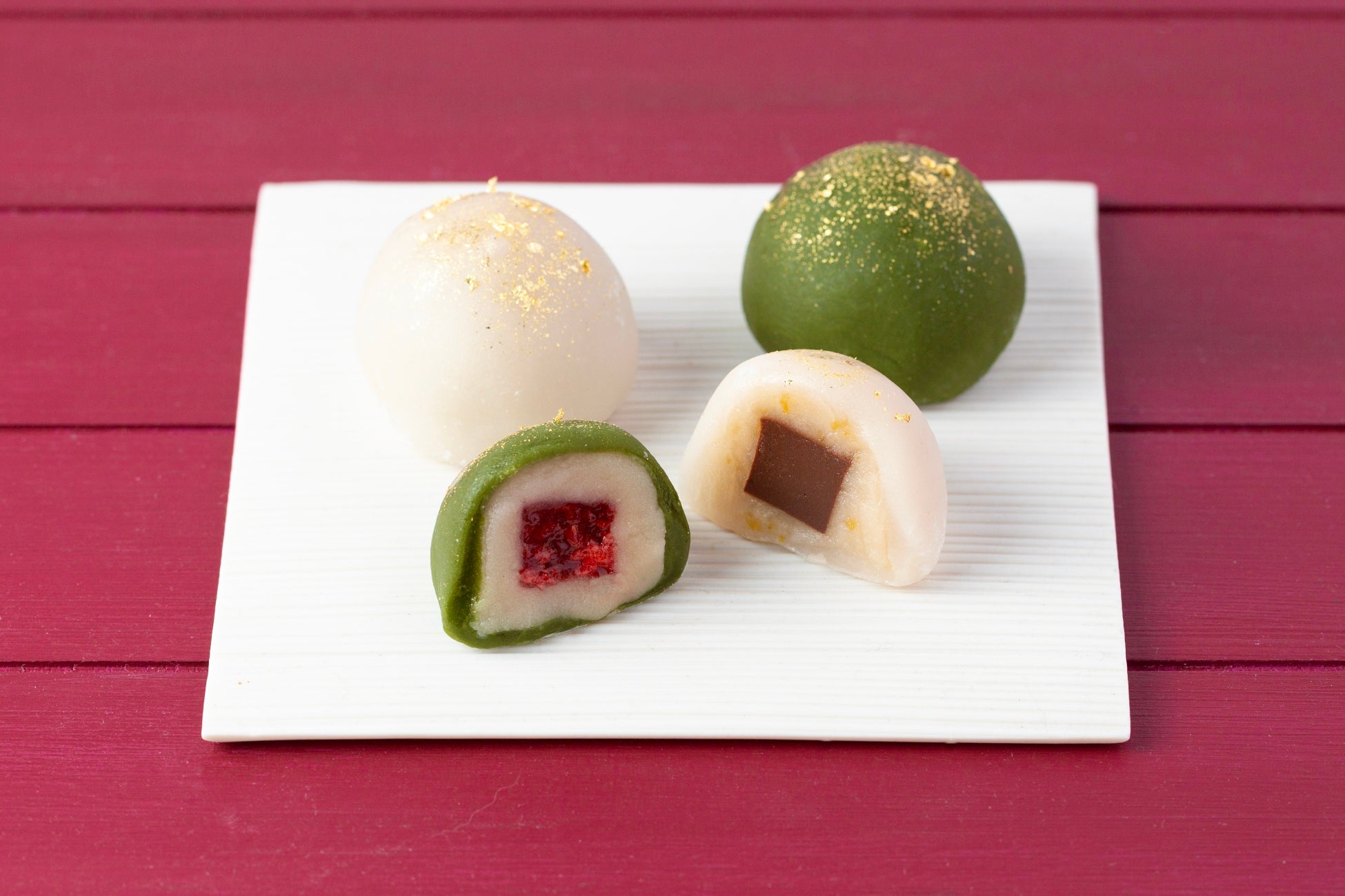 柚子チョコ大福は、真っ白なういろうをベースとした大福生地に、金箔で聖夜の星空をイメージ。抹茶と2種のベリー大福は、抹茶を練りこんだ奥深い大福生地に、金箔で夜の街並みをイメージしています。寒天の可能性を追求した、今までにない新しい大福です。