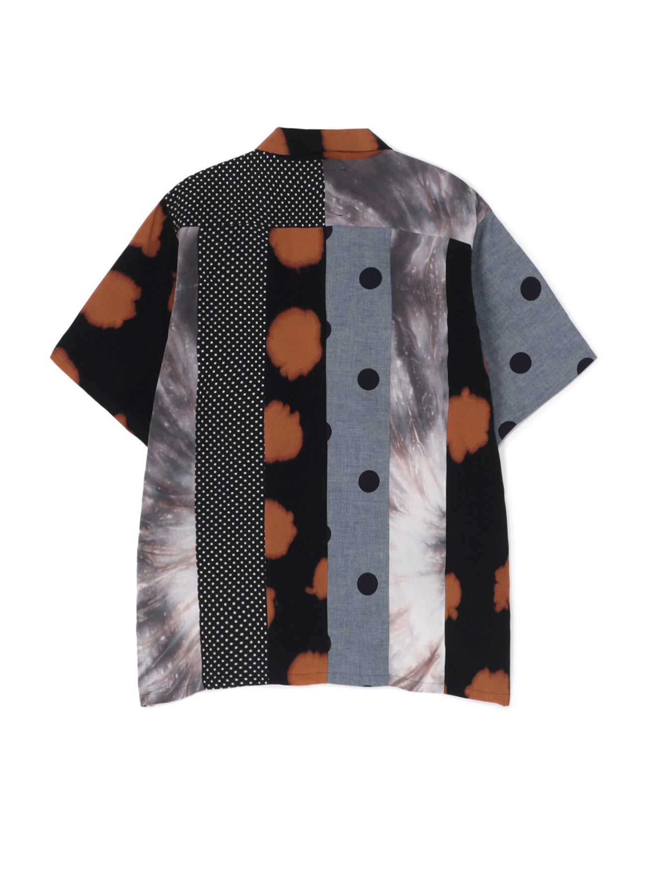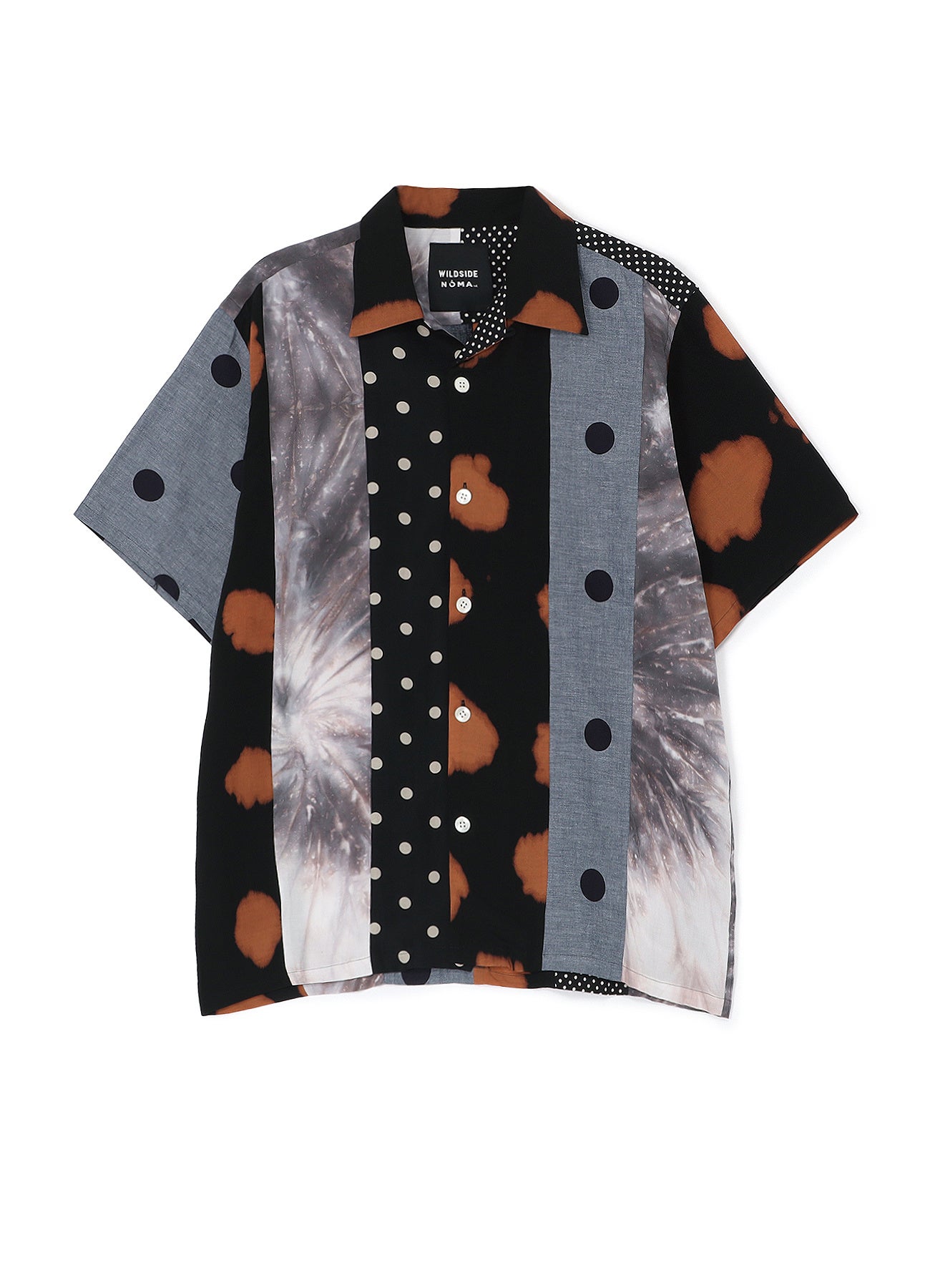 NOMA t.d.の代表的な開襟シャツをベースに、NOMA t.d.のハンドダイの生地と、Yohji Yamamoto POUR HOMMEのアーカイブのドット生地を、パッチワークで組み合わせたユニークなシャツ。渦状に染まったタイダイ柄や大きさの異なるドット柄など、5種類の異素材生地を大胆に配置した特別なアイテムとなっています。