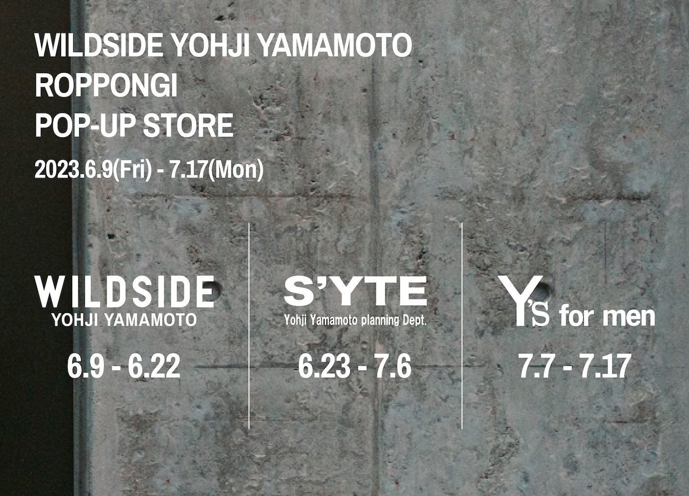 本POP-UP STOREでは、ヨウジヤマモト社が発信する、様々なブランド・アーティストとコラボレーションを実現している「WILDSIDE YOHJI YAMAMOTO」を中心に、ヨウジヤマモトのDNAとアンチモードカルチャーを昇華させ、全世界へ提案する「S’YTE」、新たにスタートする「Y’s for men」の3ブランドを、それぞれ会期を分けて特別展開いたします。