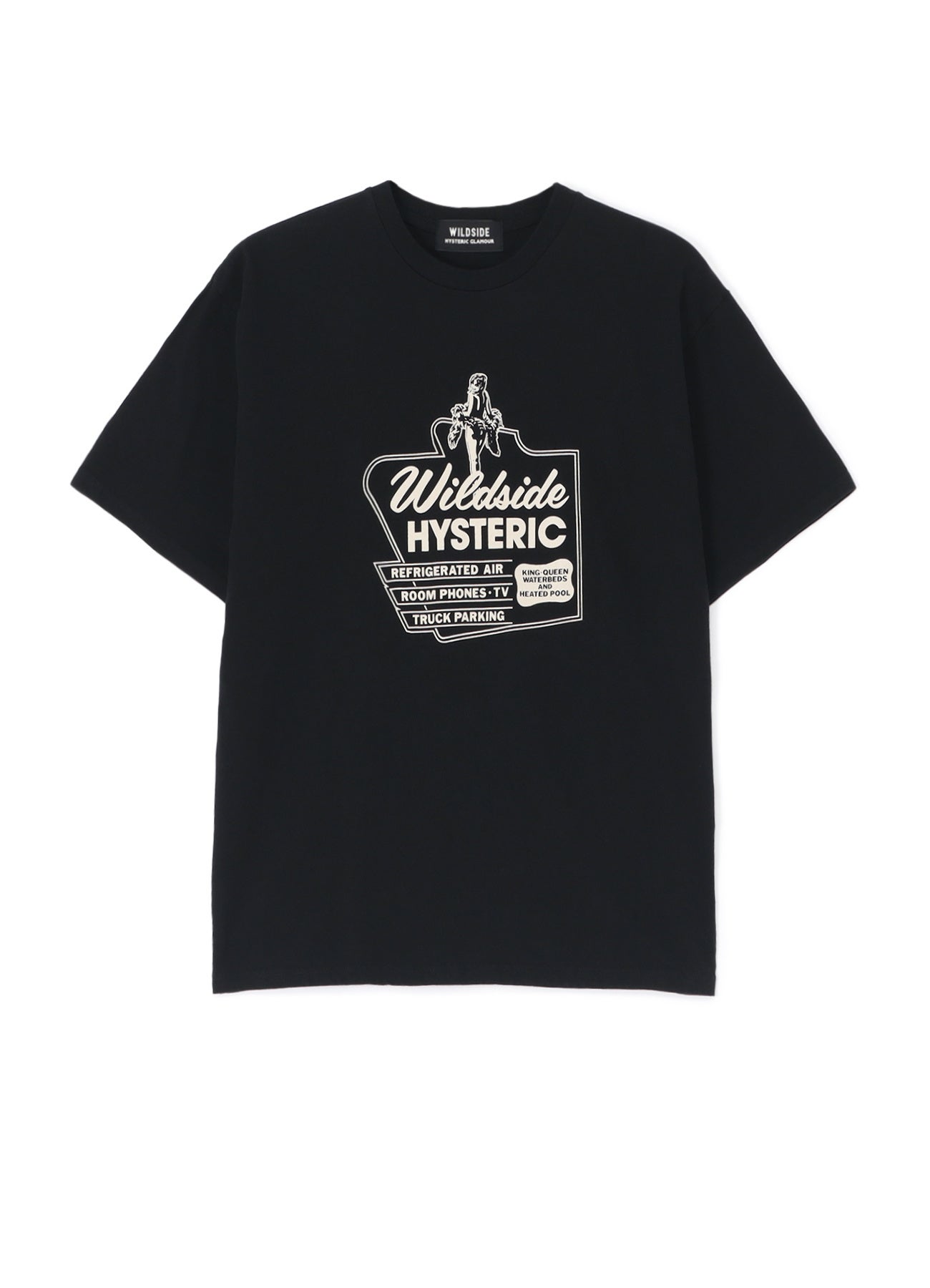 3回目となる今回のコラボレーションアイテムとして、エレクトリックギター”Flying V”を携えたHYSTERIC WOMANと、ヨウジヤマモト社のアイコニックなモチーフである”牡丹”の花を組み合わせ、魅惑的なヘヴィメタルを表現したグラフィックTシャツと、1970年代アメリカのハイウェイ脇にあるモーテルの看板をイメージした“WILDSIDE MOTEL”をテーマに作られたグラフィックTシャツの2型を発売いたします。