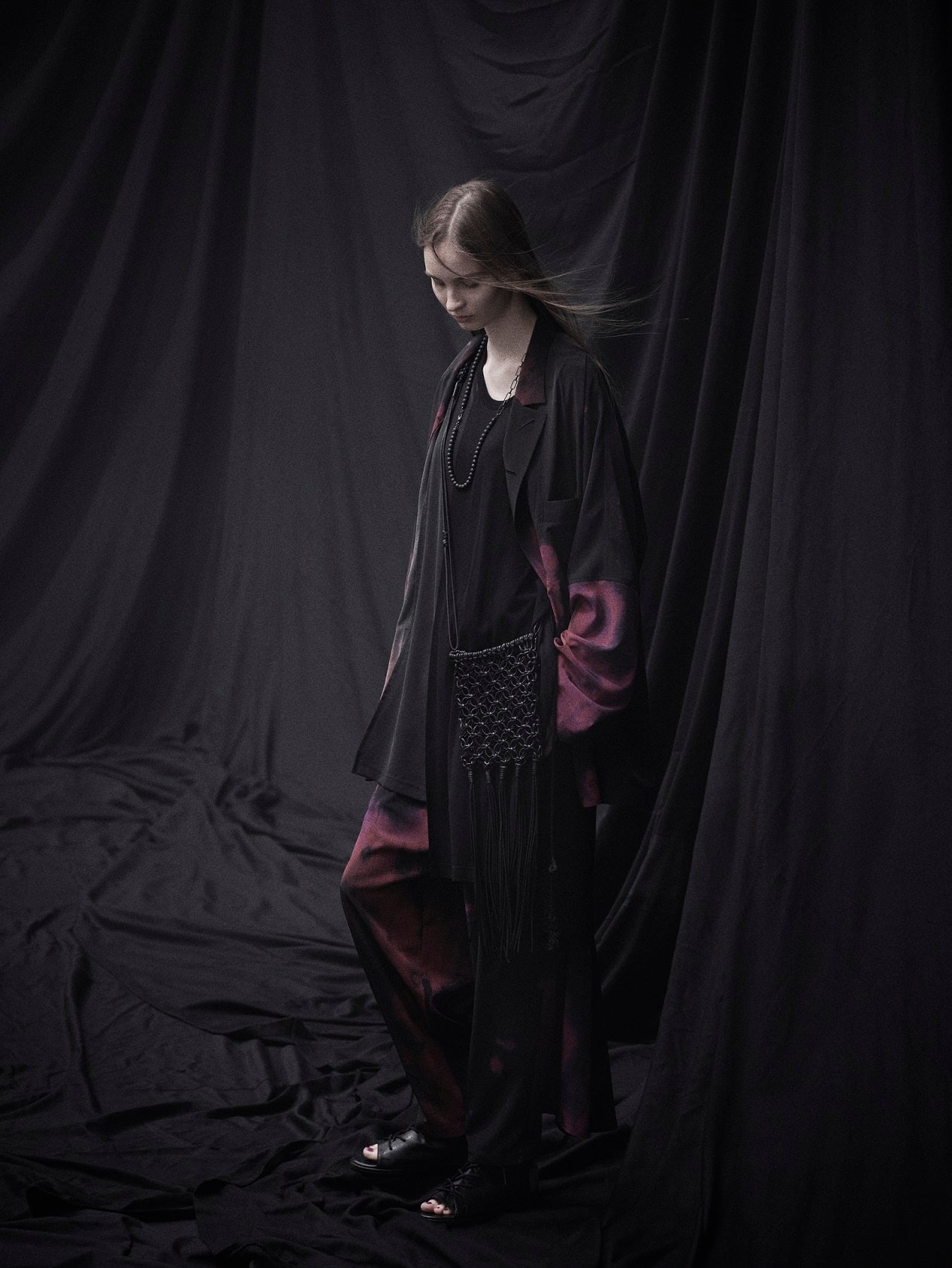 また、ファスナーやボールチェーンを使用したライダース風のセットアップや、生地をまだらに染めあげドットのような染ムラをインクジェットプリントで表現したコートなど、新作アイテムも展開いたします。2023SS全シリーズをご覧いただける貴重な機会となっております。