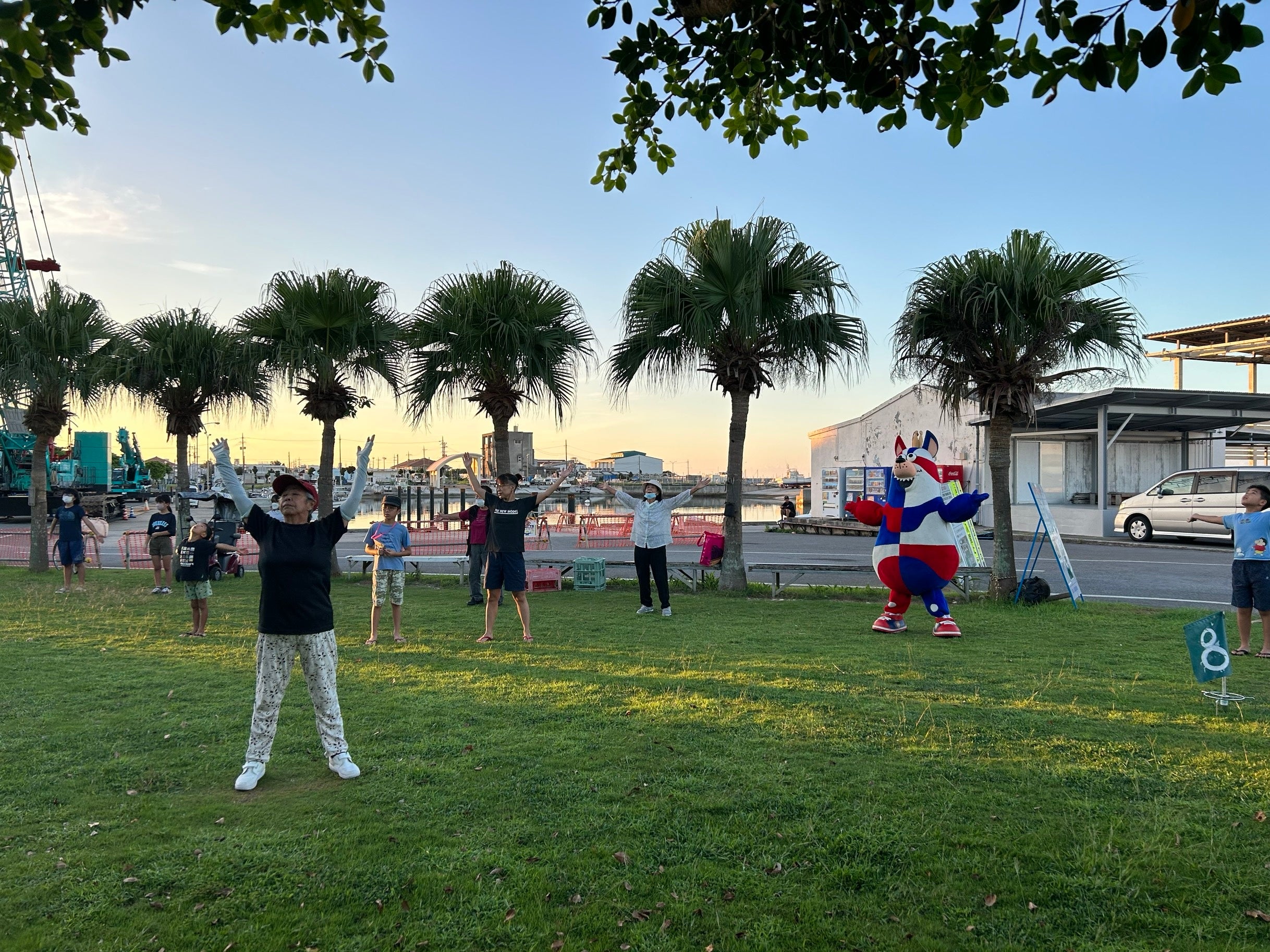 ラジオ体操では、マンタ公園にて朝早くから多くの子どもたちや地域の方々が集まり、元気よく身体を動かすことができました。ラジオ体操後にも別の曲で体操を行うなど、地域の方々からパワーをいただきました。