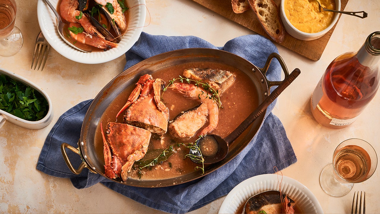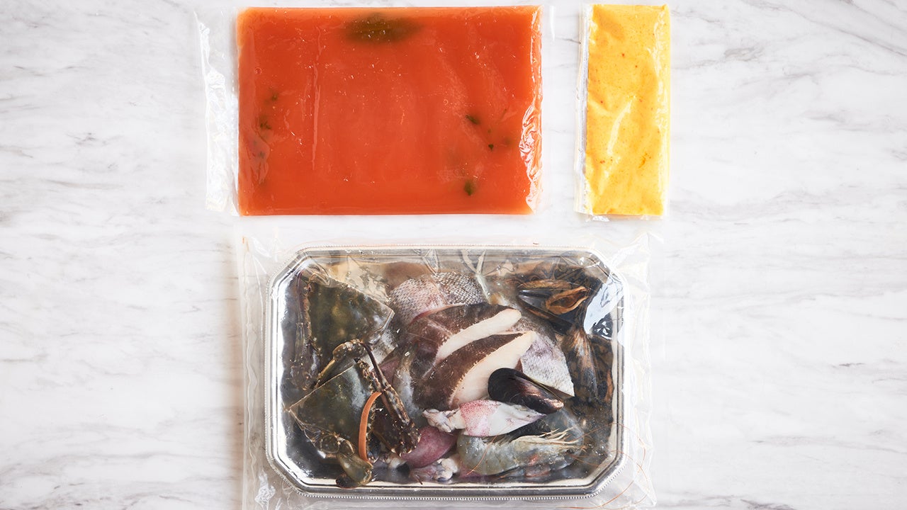 香味野菜と白ワインのブイヨン、魚のアラ、トマトを合わせた風味豊かなスープベースに、魚介を合わせた、サフラン香るブイヤベースです。カットするなど、あらかじめ調理済みの魚介を合わせて炊きあげるだけ。ルイユを塗ったバゲットを浸してどうぞ。