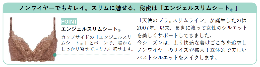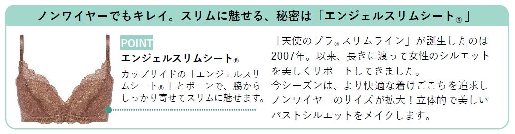 街に出る機会が増え、本格的におしゃれが楽しめるようになって初めての秋がやってきます。ニットやブラウスなど、薄手のトップスのきれいな着こなしに大活躍するのが、“脇すっきり”でおなじみの「天使のブラⓇ スリムライン」。今シーズンは、ラクなのにスリムに決まると人気急上昇中のノンワイヤーと、バストメイク力の高いワイヤー入りのブラレットデザインの2タイプがエントリーしました。