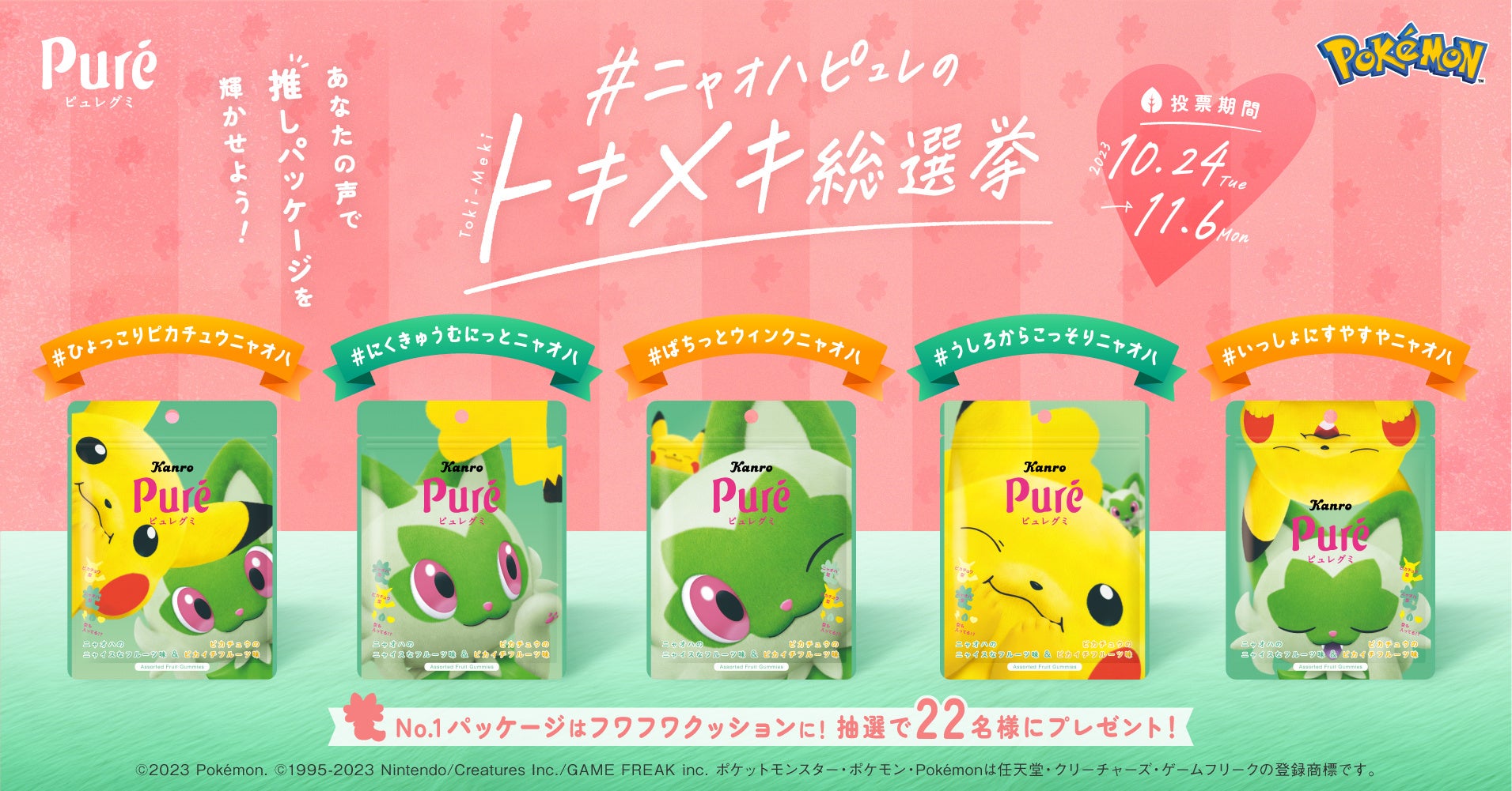 ピュレグミポケモン第7弾の発売を記念し、「#ニャオハピュレのトキメキ総選挙」をSNSで開催します。5種類のパッケージデザインの人気投票を実施し、一番人気が高かったデザインをグッズにする参加型の企画です。ぜひ、お気に入りのパッケージのグッズ化を目指して投票に参加してください。人気No.1に輝いたパッケージデザインはフワフワのクッションに!投票に参加いただいた方の中から抽選で22名様にプレゼントします。