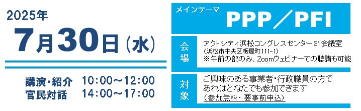 浜松市では公共施設の整備・運営等において、公共サービスの質の向上や効率化を実現するため、官民連携を推進しております。事業者の皆様に本市の取組や事業について知っていただき、よりよい事業としていくため、この度、PPP/PFIをメインテーマとし、 2025年度第1回浜松市官民連携地域プラットフォームを開催します。PPP/PFIに関する講演や本市のPPP/PFI事業の紹介の他、本市又は静岡県西部地域の自治体で検討している事業について、官民対話を行います。