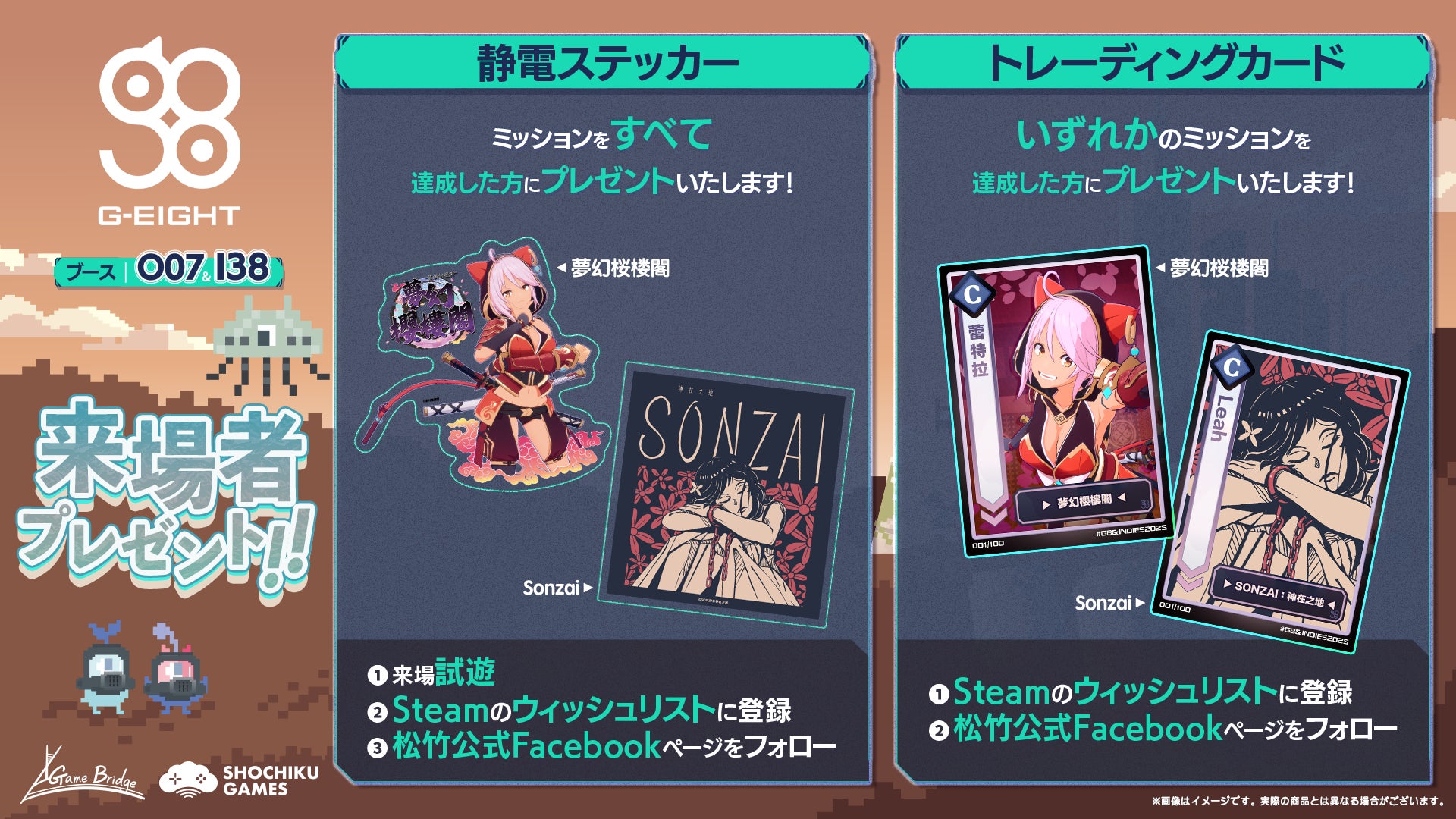 対象ゲームのウィッシュリスト登録または松竹公式Facebookファンページをフォローでトレーディングカードをプレゼントいたします。G-EIGHTとのコラボによるカードコレクションイベントにぜひご参加ください!