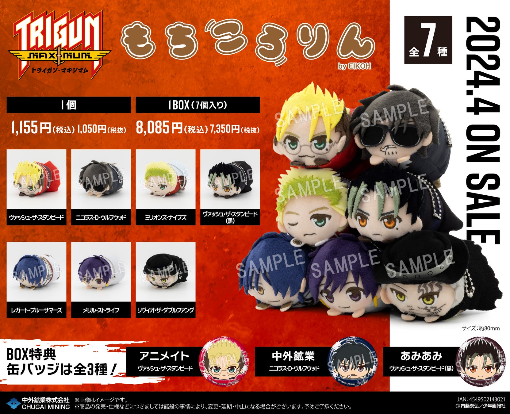 『トライガン・マキシマム』より、まんまる可愛いぬいぐるみマスコット「もちころりん」が登場!店舗別BOX特典缶バッジは3種類!