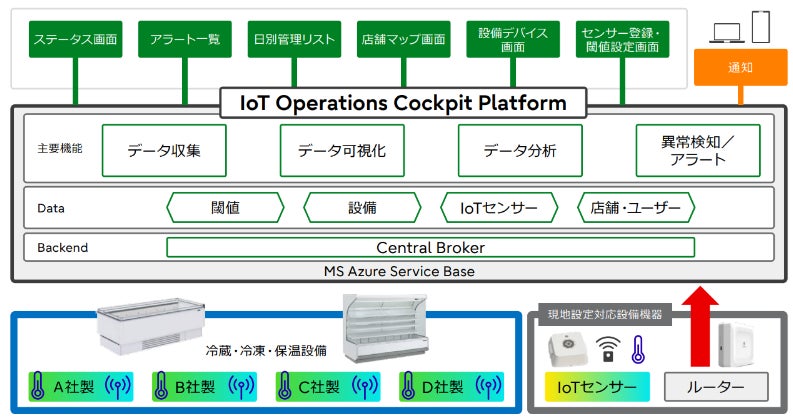 これにより、ベイシアの店舗内で実施される冷蔵・冷凍設備の温度の点検・記録業務が自動化されHACCP(Hazard Analysis and Critical Control Point)(注3)対応における店舗従業員の作業を大幅に効率化するとともに、閾値を超えた異常を検知した際にはアラート通知がなされ商品鮮度管理を強化し、食品ロス削減に貢献します。