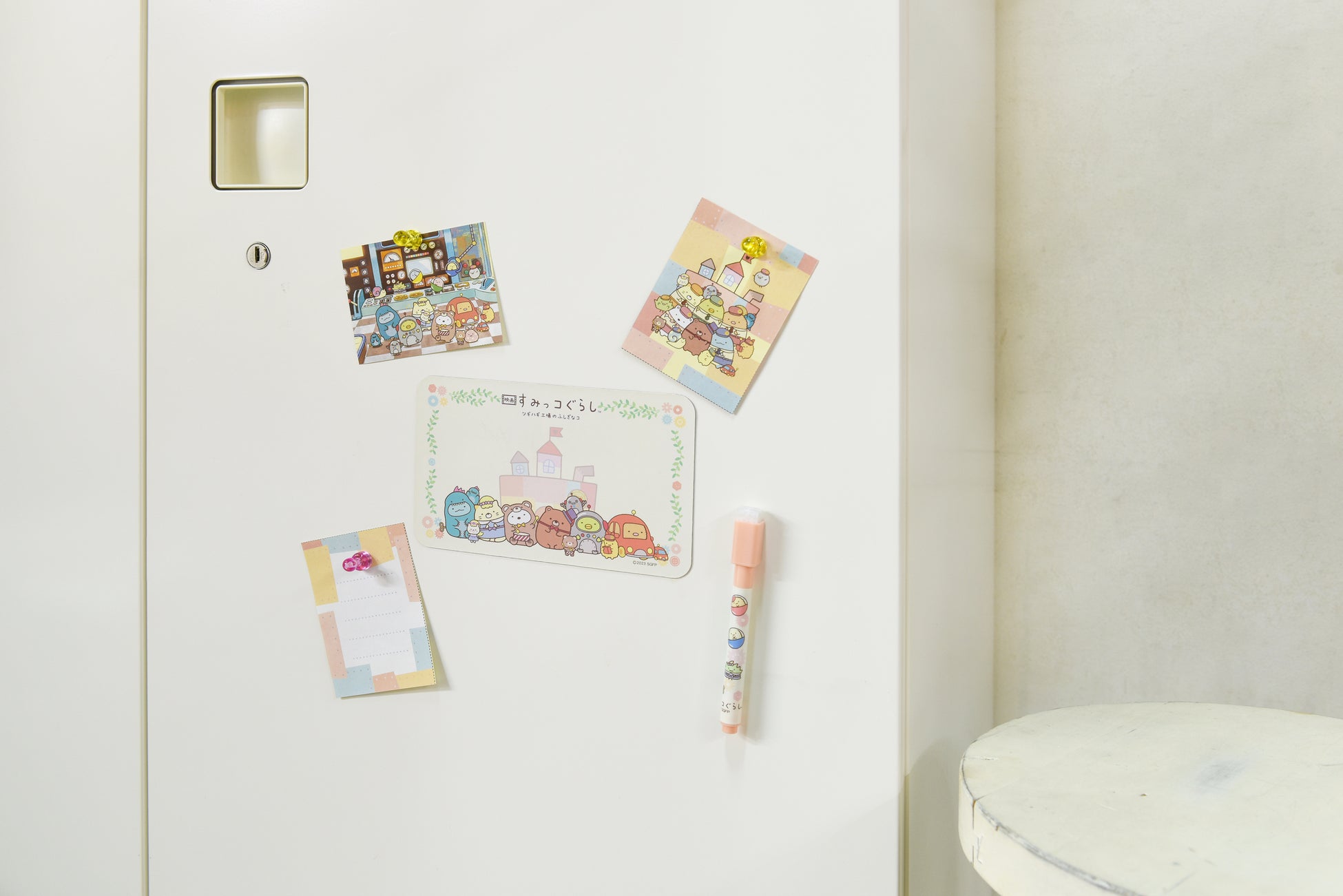 △「おもちゃなホワイトボード」と「みにっコマーカー」はマグネット式なのでスチール壁に貼り付けられます